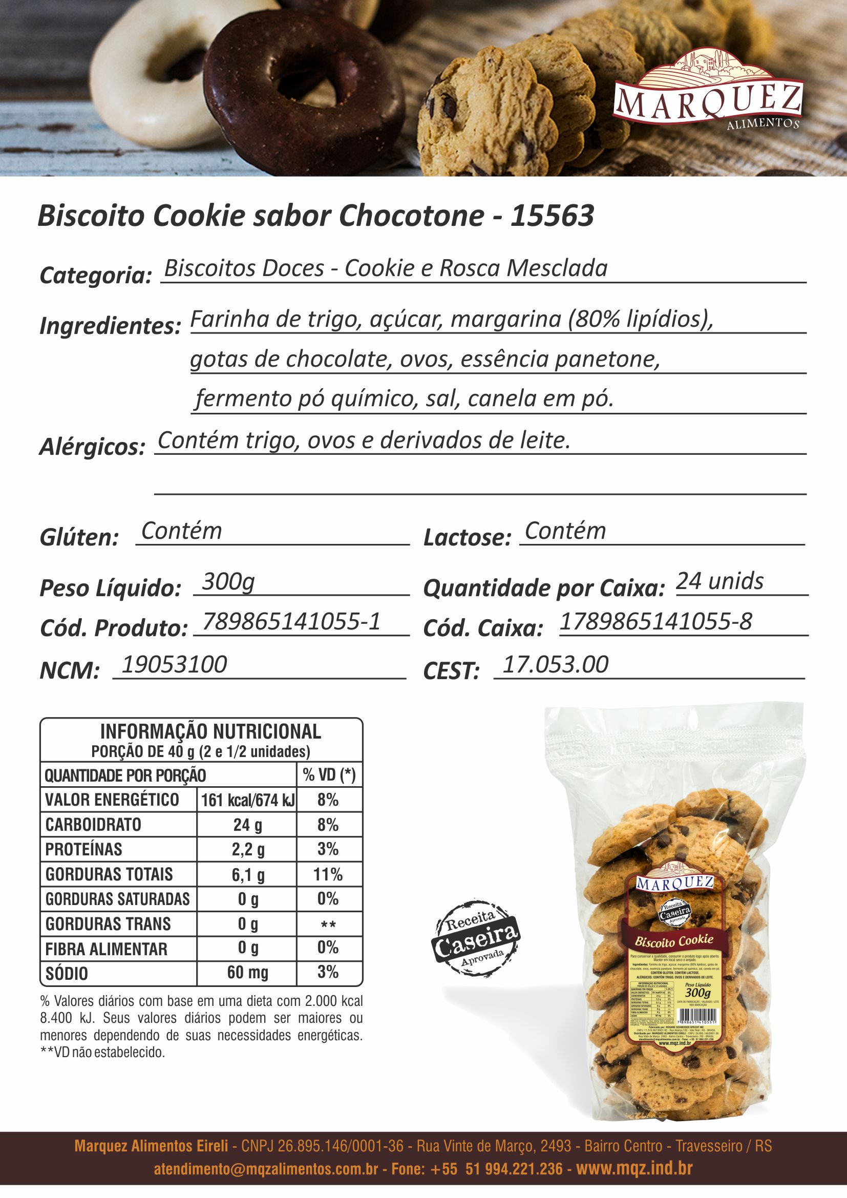 Ingredientes: Farinha de trigo, açúcar, margarina (80% lipídios), gotas de chocolate, ovos, essência panetone, fermento pó químico, sal, canela em pó.